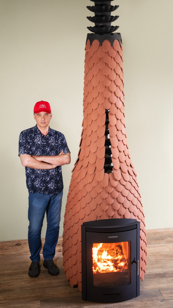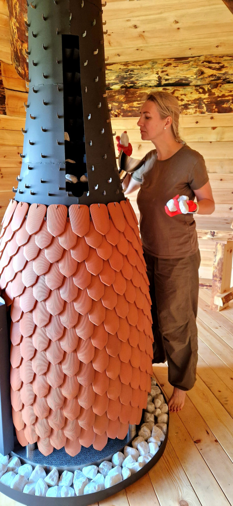 Первое, что бросается в глаза — эта печь огромна, потому что предназначена для очень больших парных. Также она крайне необычна по форме, поскольку объёмы топки и дымохода в ней соединены воедино, а все её поверхности — бионические.